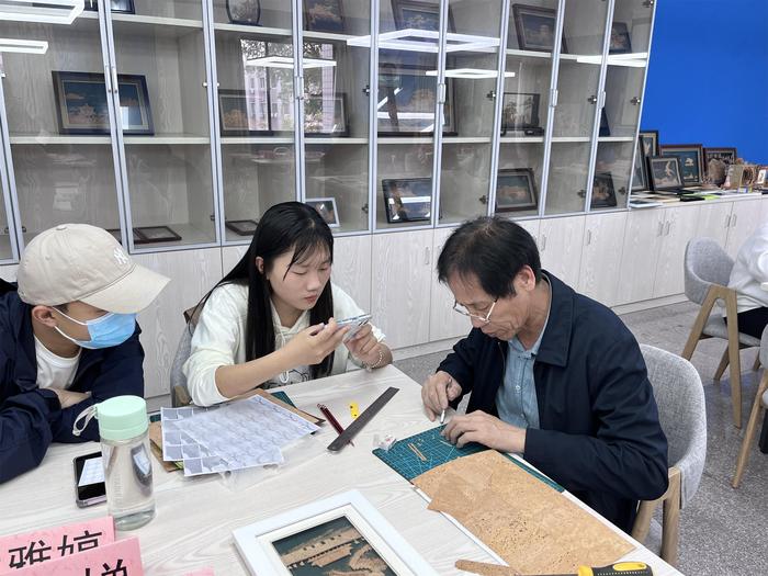 现场陈君锟大师先向大家展示了一部分软木画作品,并介绍了软木画的材料特点和制作工艺等,带领大家探寻一块木头如何变成一幅绚丽的“无声的诗,立体的画”。随后,前来体验的同学们开始尝试雕刻,陈君锟大师轮流到每个桌子前手把手、一对一教学。在陈君锟大师和现场志愿者的帮助下,同学们使用工具裁切软木片,对照半成品用刻刀裁剪出各种形状。本次体验活动共有三次,陈君锟大师会根据大家的学习进度推进三次的体验课内容,并且累计打卡三次,可以免费带走自己DIY的作品。