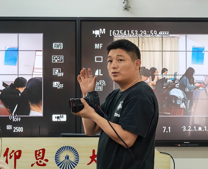 在技能讲解环节,林老师通过多媒体设备连接相机主屏,对节点校准与相机设置流程进行了细致演示,逐一讲解各项参数的功能与调整方法,让抽象的技术操作变得直观清晰。针对同学们普遍关心的手机拍摄问题,林老师也系统分析了手机设备在专业拍摄中的局限性,帮助同学们树立更科学的专业认知。
